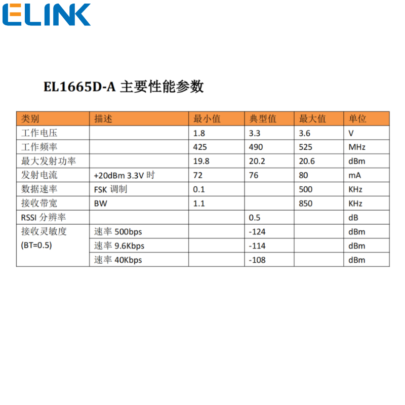 EL1665D-A 是一款采用 SI4438 內(nèi)核設(shè)計的輸出功率為 100mW 的高性能 無線收發(fā)通訊模組。工作頻段為 425MHz~525MHz,默認(rèn)頻段為 490MHz。 EL1665D-A 是高性能低電流的 425MHz~525MHz 收發(fā)模組,采用 SI4438 內(nèi)核設(shè)計,包括完整的發(fā)送器和接收器。接收靈敏度為-124dBm,最大輸出 功率+20dBm,支持(G)FSK,OOK 調(diào)制方式,數(shù)據(jù)速率從 100bps~500Kbps,工作 電壓 1.8V~3.6V,關(guān)斷電流 30nA,待機電流 50nA。主要應(yīng)用在遠傳抄表 (802.15.4g & MBus)、遙控、家庭安全和告警、車庫和大門開啟、遙測、家 庭自動化、傳感器網(wǎng)絡(luò)、健康監(jiān)視等。