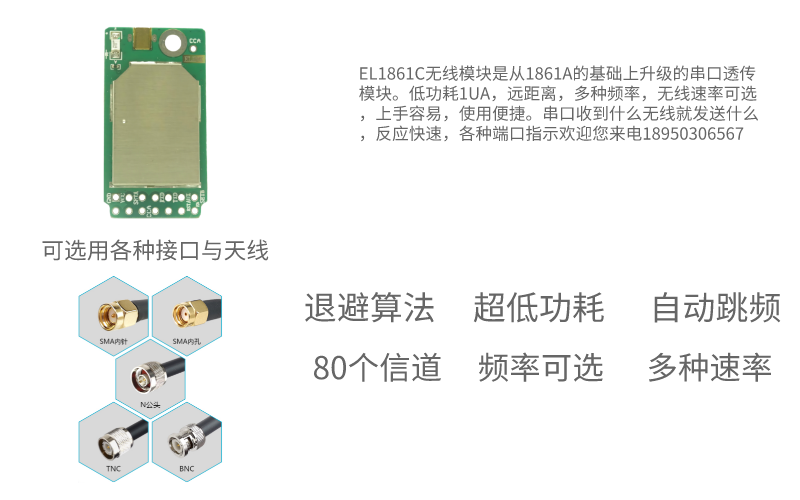 EL-1861C具有尺寸小,功率大,靈敏度高,傳輸距離遠(yuǎn),通訊數(shù)率高,在無線速率2.4kbps下通訊距離空曠地可達(dá)3500米.內(nèi)部自動完成通訊協(xié)議轉(zhuǎn)換和數(shù)據(jù)收發(fā)控制等特點(diǎn)。